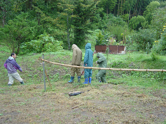 わたしは「やろうぜやろうぜ」って気分で、荷造り用のビニール紐を取りに行き、竹の棒もいるな と思い振り返ると、vivakenは一束の細い野菜作りのとき支柱に使った竹を、すでに、抱えてきていました。