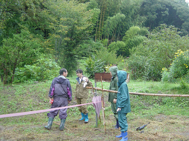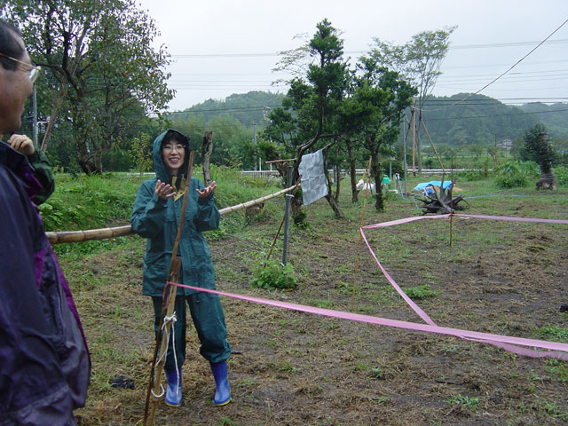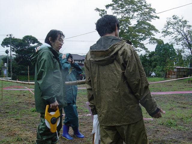 網野さんは 傘もささずにポジションの指示。名取さんは距離の測定と記録。奈々さんは水平からの高さ測定。vivakenと私は、機器をぬらさないように、または 記録紙をぬらさないよう、傘をさす係り。