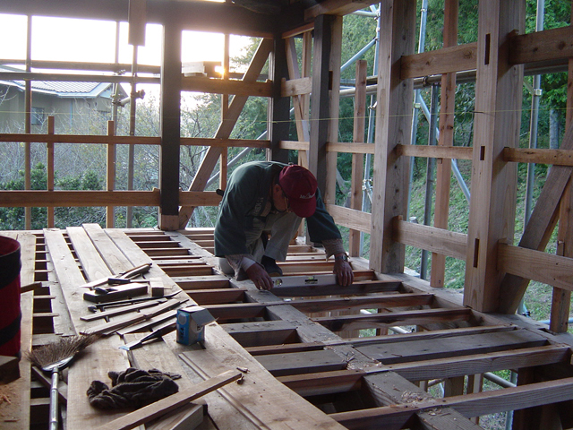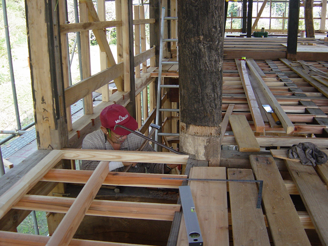 3尺6尺に刻まれた材を 根太として一本一本組み込んでいく作業を見ると、ノミと金槌で淡々と組み上げる事に 不合理など一片のかけらもないのだと感じます。