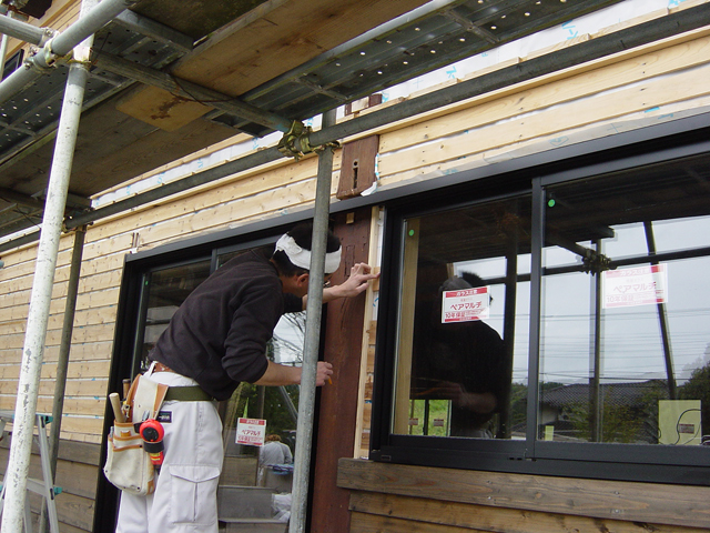 こんな サッシの窓枠は 周りの四角いフランジと呼ぶ部分は樹脂のアングルで止めつけるのが一般的のようですが、どんぐり庵の場合尺寸はさほど問題にならないにしても、現物あわせの事象がおおく出現する事は間違いないという岩熊さんの判断から サッシの枠は工夫を重ねて準備されたものです。