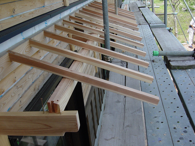 窓やベランダにかかる”霧よけ”の骨組みが作られています。