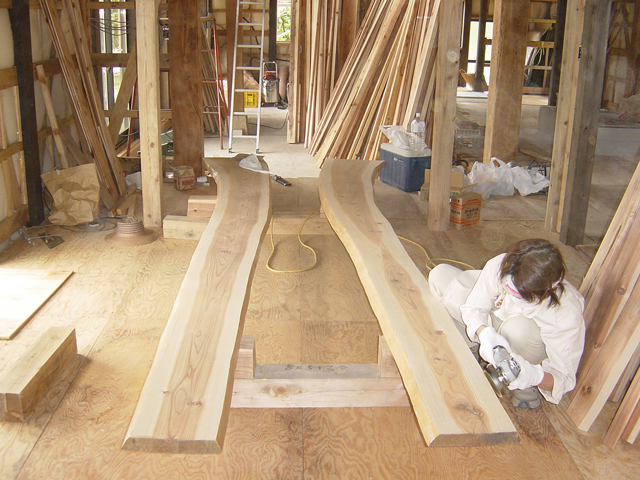 あまりくどくならない程度に耳付きの板を使いたいと希望しました。使うに当たり 耳と呼ばれる部分の樹皮うをはがす事を 私たちが請け負いました。