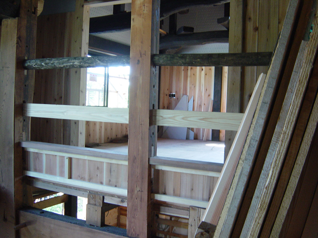 この写真では見えませんが 壁際に打ち付けられた 手すりを補強する板は 階段に使うために杉板の耳を掃除した あの板の残りの部分が使われていました。